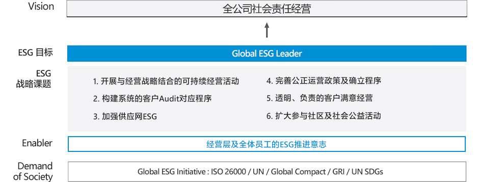 ISU PETASYS为了应对外部对企业的社会责任的要求,强化全公司的社会责任经营,确立了ESG战略执行体系。公司导出对6大战略课题的详细执行计划及成果指标,并检验年度成果,以相关部门为单位持续发掘执行ESG战略的改善方案。为了使全体员工在执行业务时,将推进ESG的价值与行动标准内在化,公司正在强化环境、伦理、人权等方面的ESG运营。