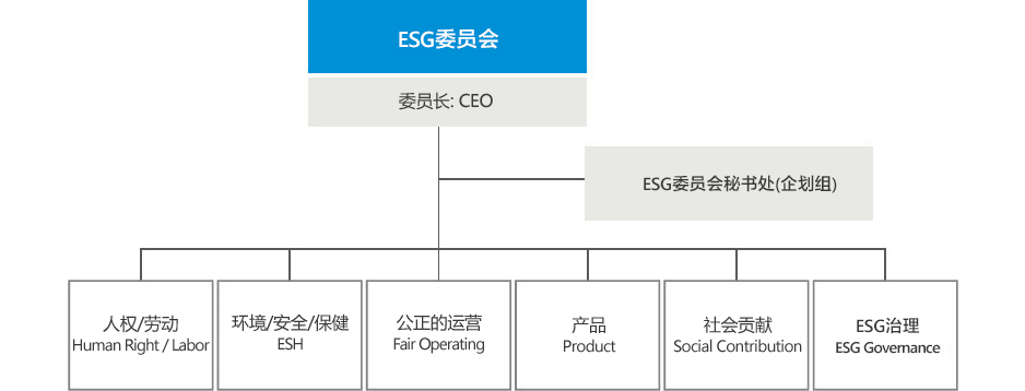 ISU PETASYS在董事会内部以小委员会方式运营由CEO和各领域负责人员构成的ESG委员会,将ESG整合到公司战略和运营中并推进。ESG委员会审议战略和政策,检验活动成果,在最高决策过程中讨论ESG观点的风险和机会。由ESG委员会秘书处主管,与各领域负责人一起综合管理人权/劳动、环境/安全/保健(ESH)、公正的运营、产品、社会贡献、ESG治理活动。