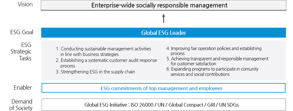 ISU PETASYS has established a system to implement ESG strategies so that it can meet the demand for corporate social responsibility and strengthen its socially responsible management at the company level. The company reviews the annual performance based on the action plans and performance indicators for six strategic tasks, and constantly improves the plans for the strategic implementation of ESG activities by each department. The company reinforces the ESG management in the fields of environment, ethics, and human rights so that all employees can internalize the value and standard of behavior for the promotion of ESG activities.