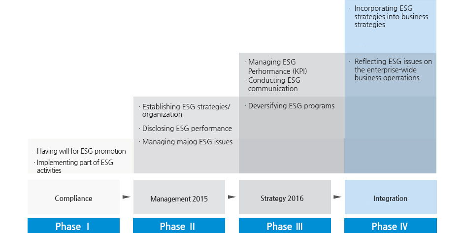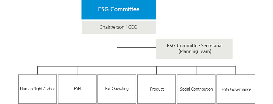 ISU PETASYS has operated the ESG Committee that consists of the CEO and executives in charge of each sector as a subcommittee of the Board of Directors to incorporate the ESG activities into corporate strategy and management. The ESG Committee deliberates the ESG strategies and policies, reviews the accomplishments of ESG activities, and discusses risks and opportunities from the ESG perspective in the top decision-making process. Moreover, the ESG Committee Secretariat takes the lead in integrating and managing the activities in the fields of human rights and labor, environmentㆍsafetyㆍhealth (ESH), fair operation, product, social contribution, and ESG governance.